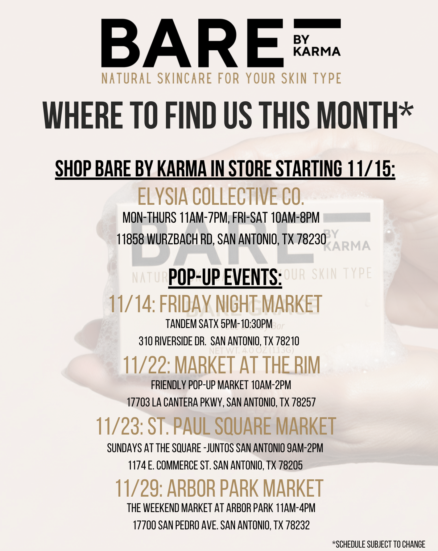 Find BARE by Karma at local markets and in select boutiques. Our clean, small-batch skincare products are available at trusted retailers who share our passion for natural beauty and skin-type-specific care.